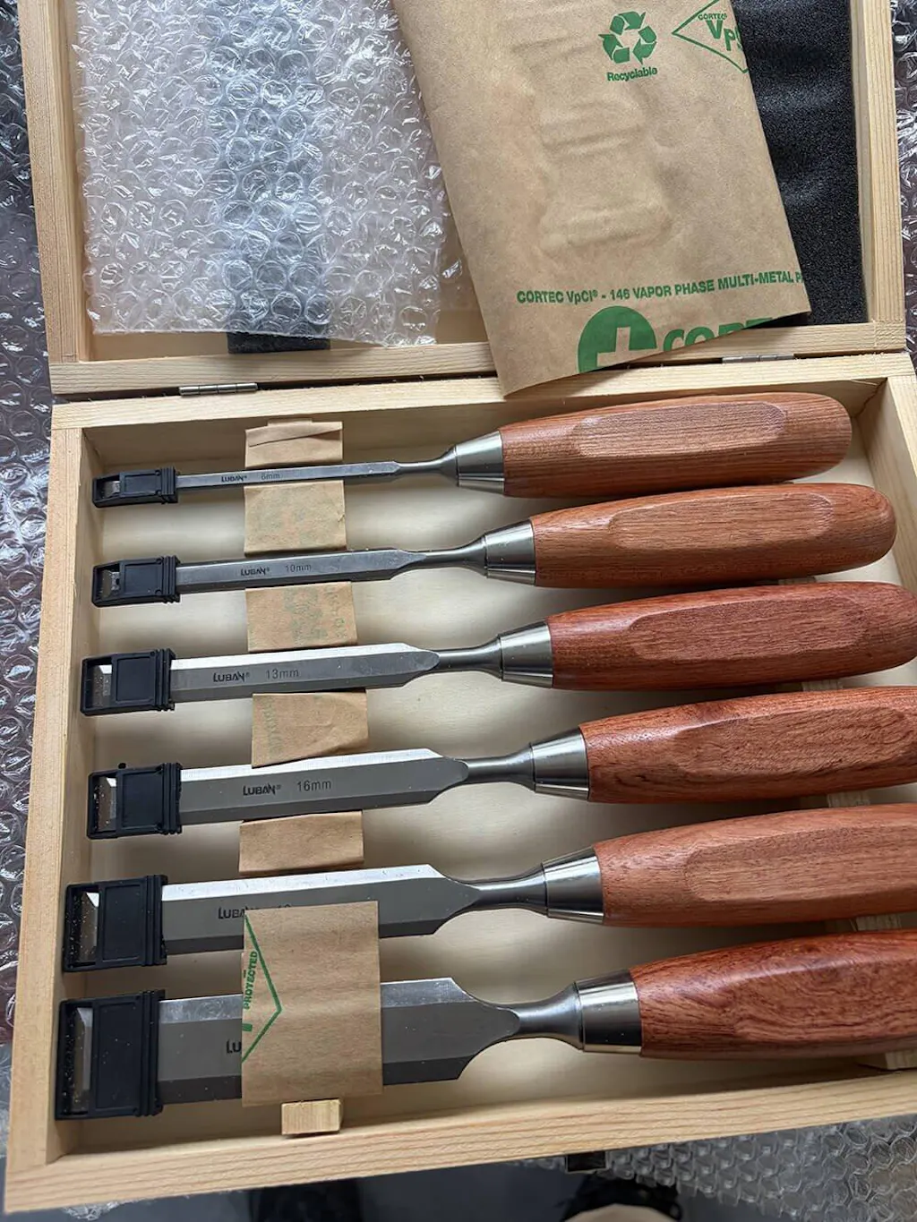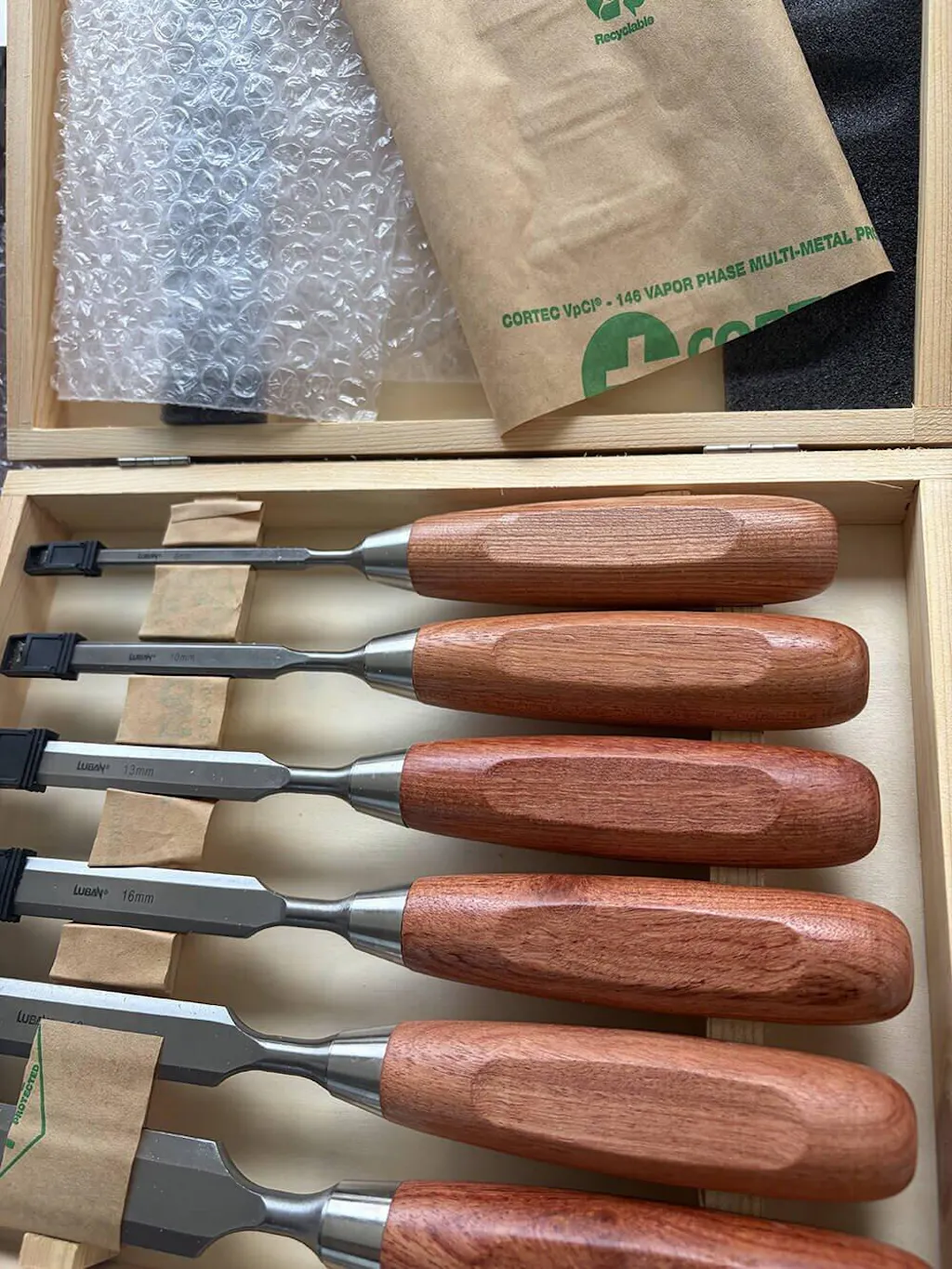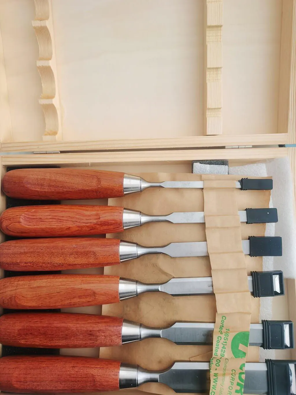 6pcs Chisels Set includes 6mm, 10mm, 13mm, 16mm, 19mm, 25mm widths. Comes in a sturdy wooden case.