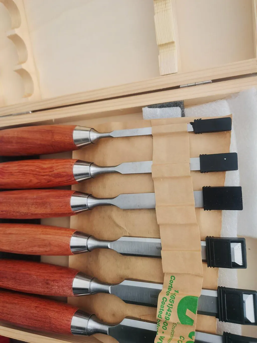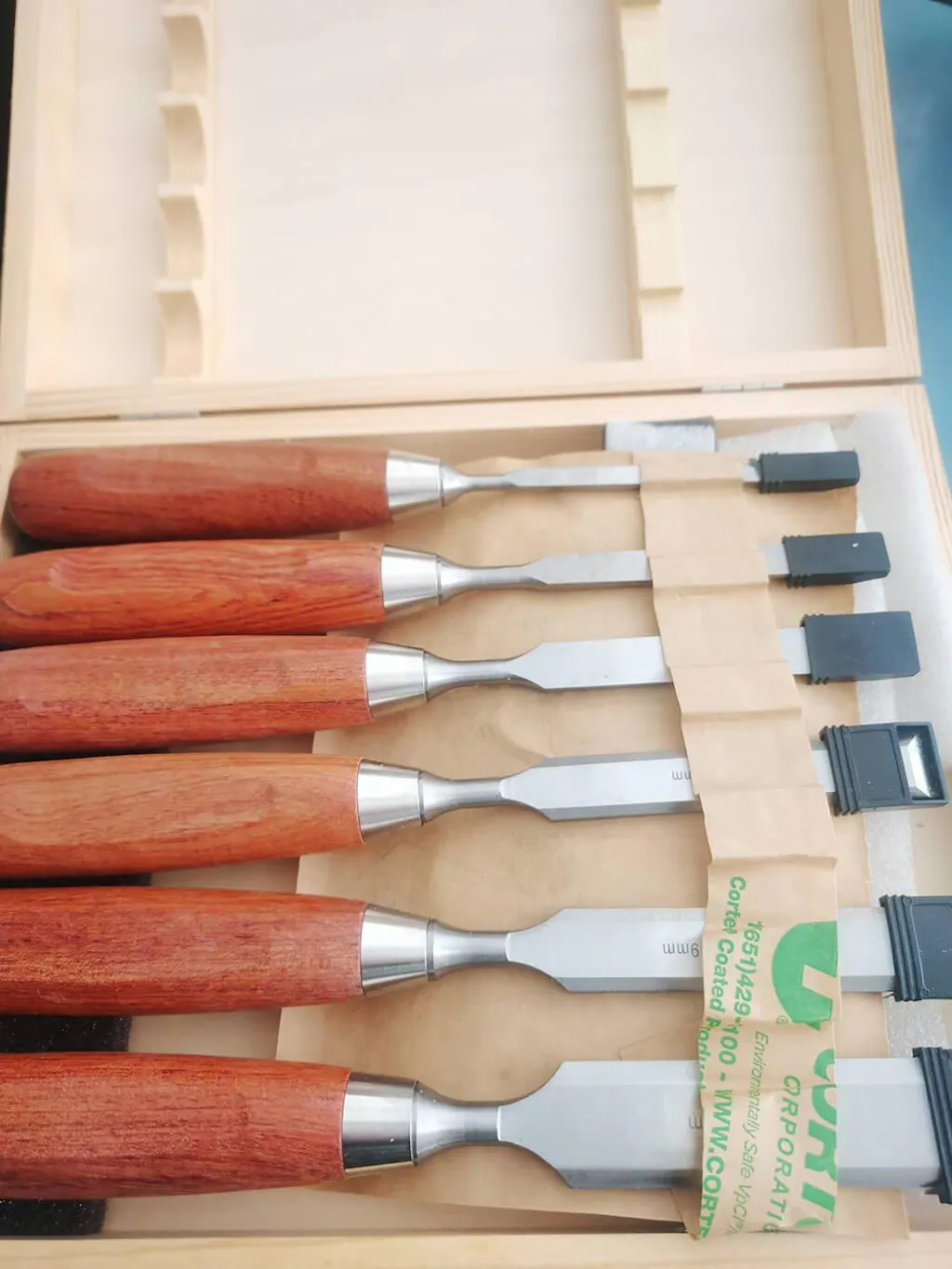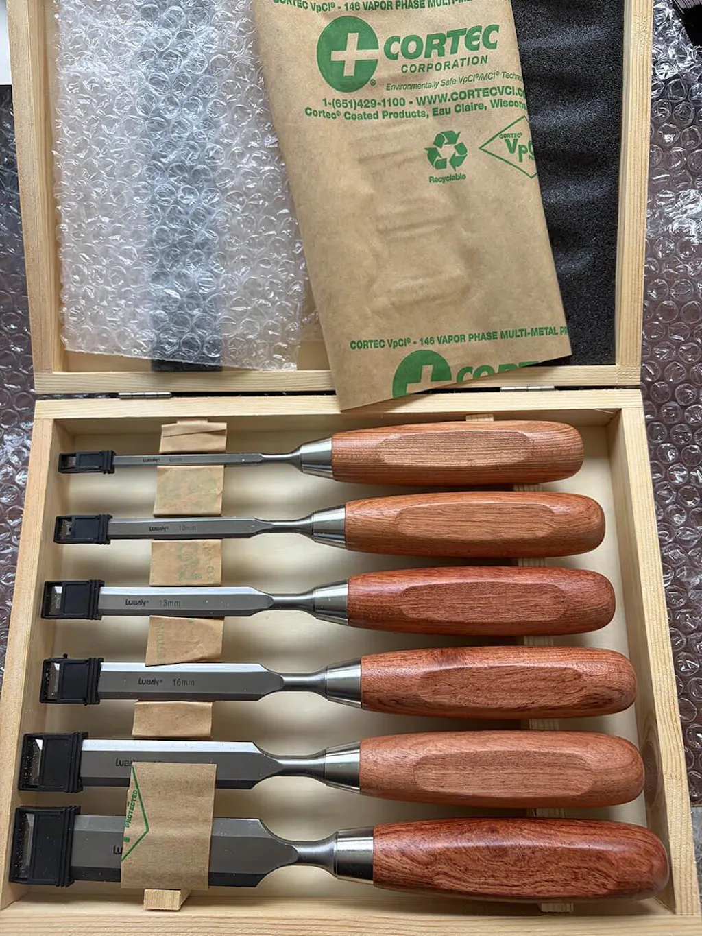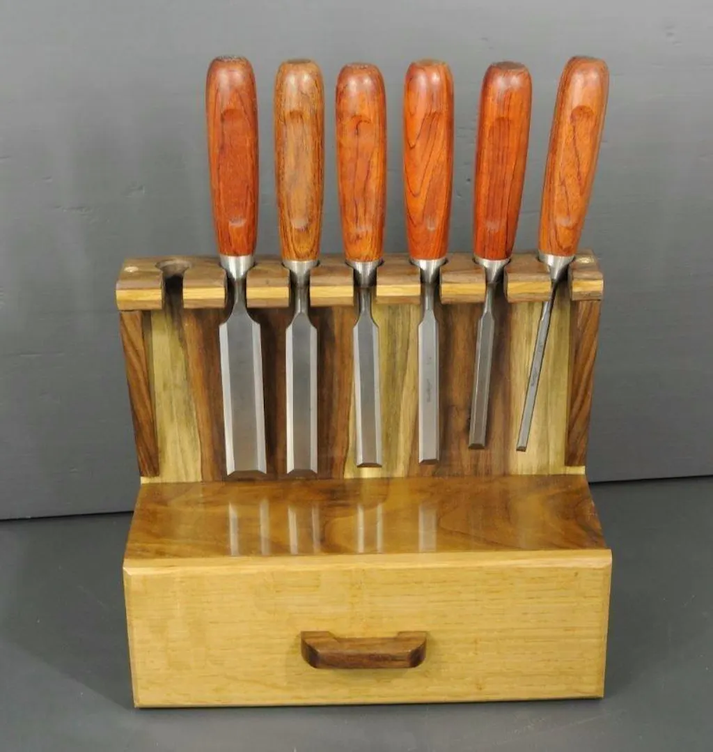 6pcs Chisels Set includes 6mm, 10mm, 13mm, 16mm, 19mm, 25mm widths. Comes in a sturdy wooden case.